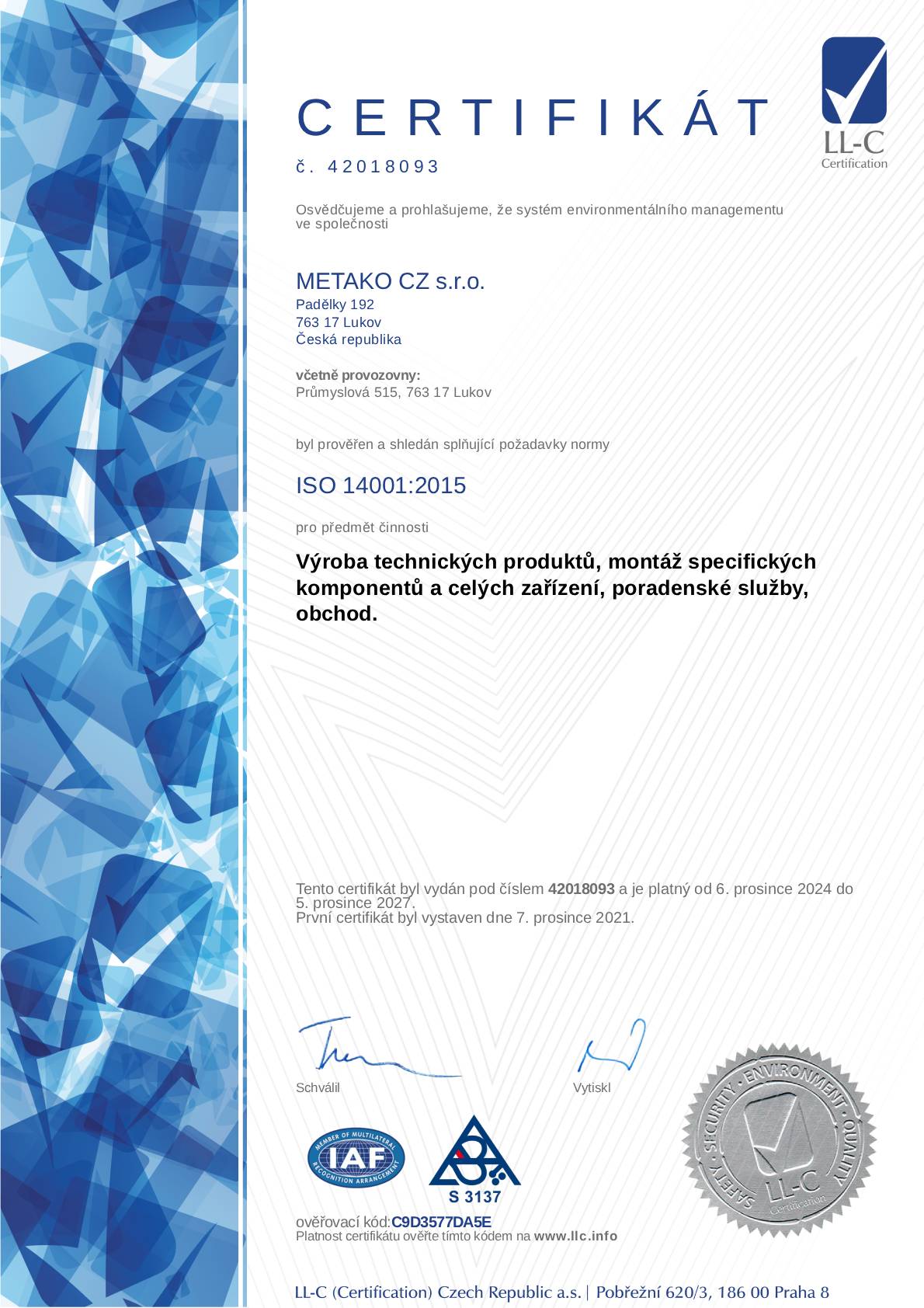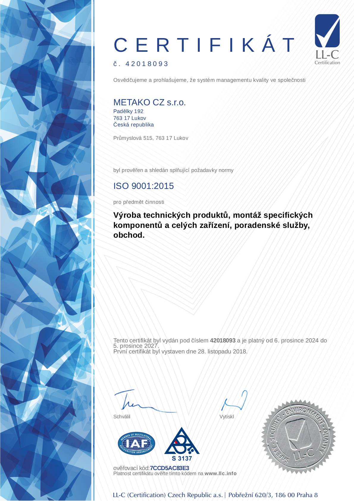 Potvrzuje splnění požadavků týkajících se naší obchodní činnosti, výroby technických produktů i montáže speciálních komponentů a celých zařízení. Součástí certifikátu jsou poradenské služby a obchod. Celý systém managementu kvality ve společnosti Metako s.r.o. byl prověřen s kladným výsledkem.